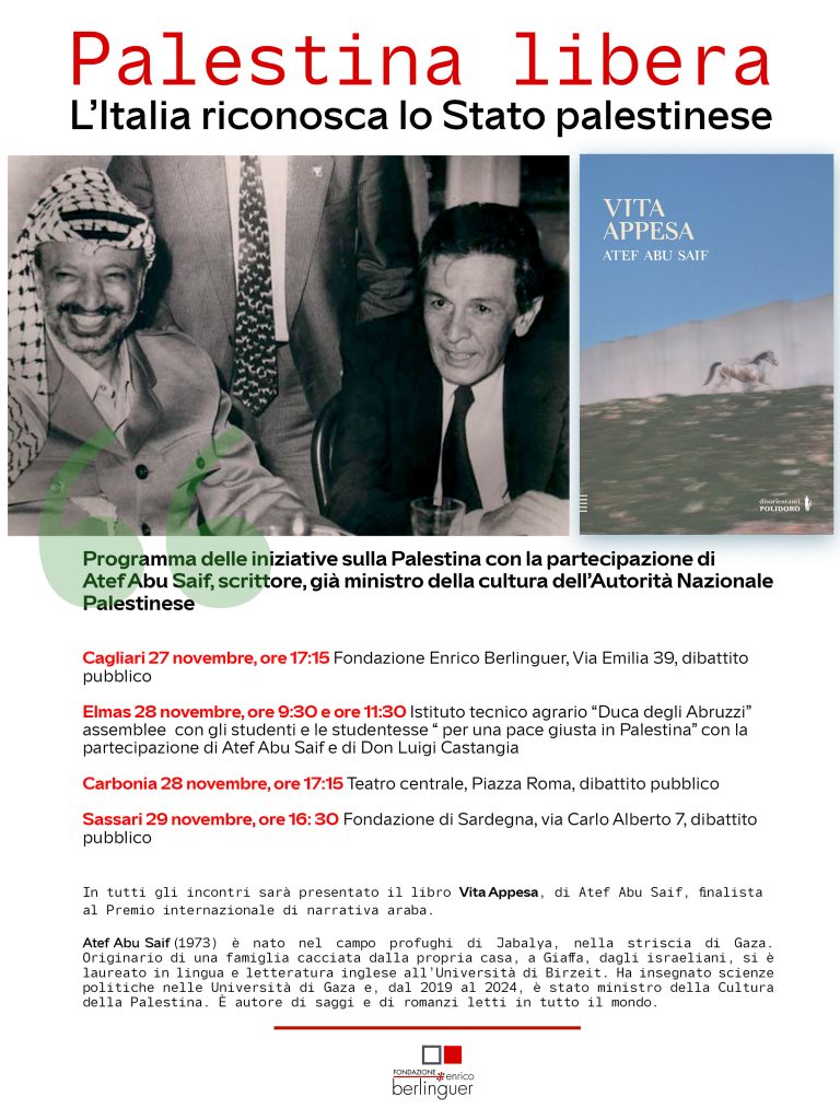 La Fondazione Enrico Berlinguer  ha invitato AStef Abu Saif in Sardegna per partecipare ad una serie di incontri pubblici con l’intento di contribuire a tenere sempre vivo l’impegno per la libertà del popolo palestinese e il suo diritto ad essere Stato libero e sovrano. Per questo obiettivo è necessario che anche l’Italia riconosca lo Stato palestinese come hanno già fatto la gran parte dei Paesi del mondo, la Città del Vaticano e, recentemente, anche Gran Bretagna, Francia, Canada, Australia e altri Paesi del blocco occidentale.